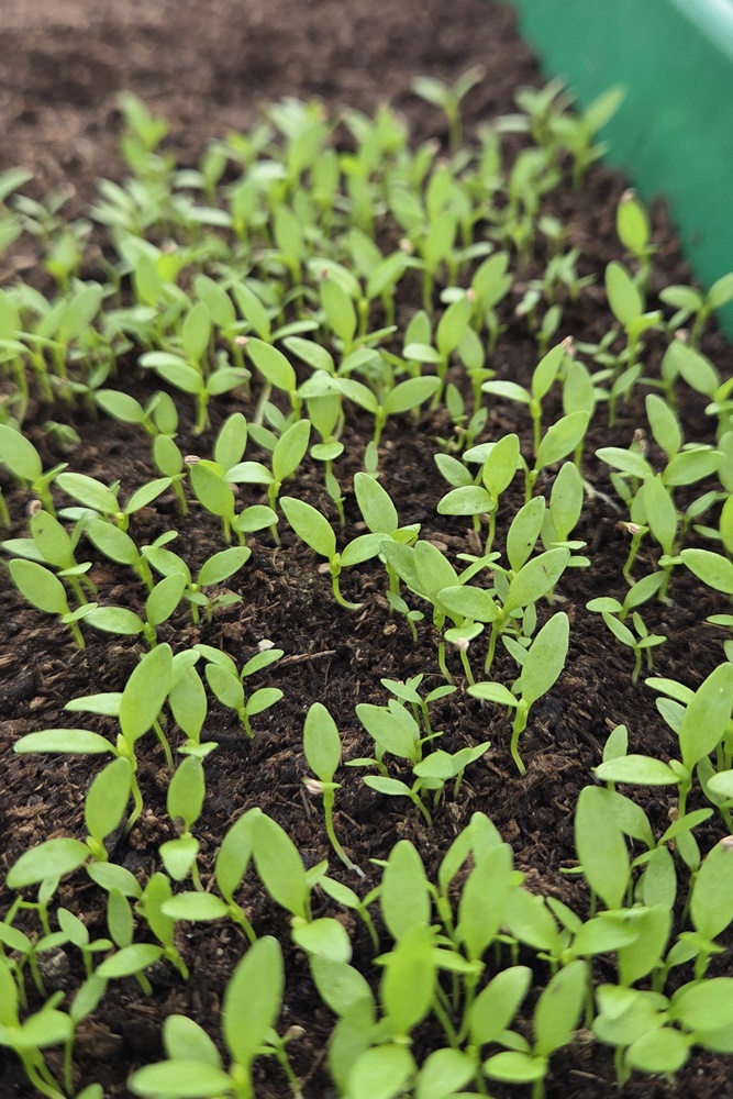 Alle Stadien des Wachstums haben wir gerade beisammen: erste Keimung der Aussaaten beim Basilikum, die Kinderstube der Selleriepflänzchen, die kleine Tomate Ruthje in ihrem ersten Zuhause, bevor sie getopft wird.