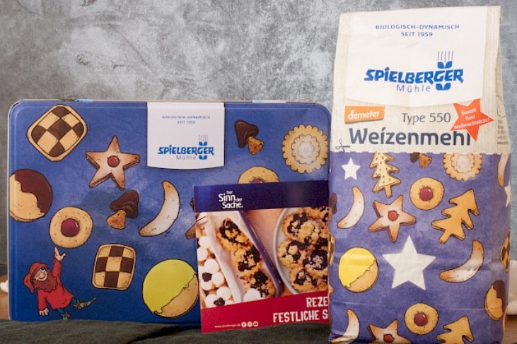 Diese gibt es mit Weizen- oder Dinkelmehl. Ihr findet eine richtig schöne Plätzchendose mit Rezept und einer Tüte Mehl von unserer Lieblingsgetreidemühle.