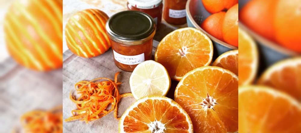 Alle weiteren Orangen mit dem Messer schälen, so dass das Weiße komplett ab ist. In kleine Stückchen schneiden. Die Zesten und den Saft einer Zitrone zusammen mit dem Gelierzucker und Vanillepulver in einem Topf aufkochen.
