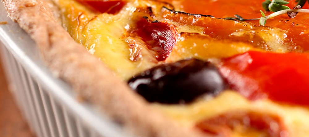 Milch, Eier und Crème fraîche miteinander verrühren, mit dem Gemüse vermischen und auf den Teig gießen. Bei 170 °C ca. 35 – 45 Minuten backen.