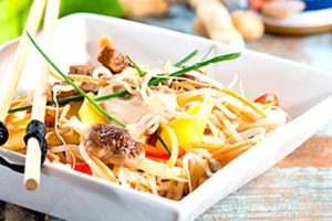 Würziges Wokgericht mit mariniertem Tofu, knackigem Gemüse und Mango, verfeinert mit Erdnusssoße, Limette und aromatischem Ingwer.