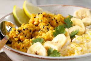 Cremiges Rotes Linsen-Dal mit Kokosmilch, Curry und Limette, serviert mit aromatischem Gewürzreis, Koriander und knusprigen Bananenchips.