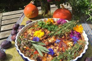 Der bunte Herbst ist in seiner vollen Pracht: Kürbis, Zwetschgen, Blumen und Kräuter in eine leckere Tarte.