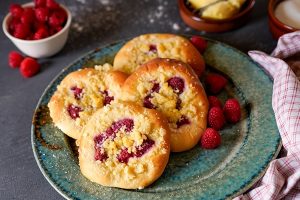 An einem sonnigen Nachmittag sind selbstgebackene Streuseltaler, die die Frische der Beeren in sich tragen, genau das Richtige.
