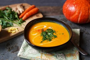 Der Hokkaido-Kürbis eignet sich wunderbar für Suppen. Neben der klassischen Kürbissuppe ist hier