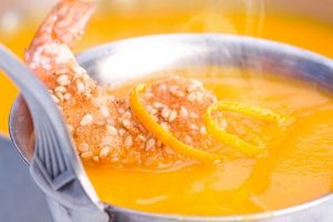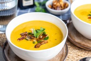 Fruchtige Karotten Orangen Suppe mit Ingwer, Chili und Orangensaft, cremig püriert und optional mit knusprigen Garnelen oder Samosas serviert.