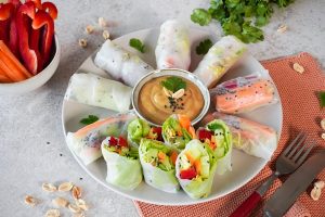 Leichte, frische Sommerrollen mit knackigem Gemüse, cremiger Erdnusssoße und asiatischem Flair – ideal als gesunder Snack oder Vorspeise.