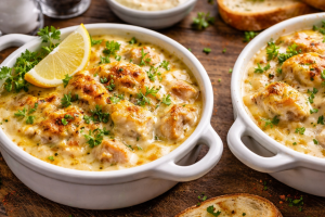Cremiges Ragout aus zartem Fleisch, würzig abgeschmeckt und goldbraun mit Käse überbacken, klassisch serviert mit frischem Toast.