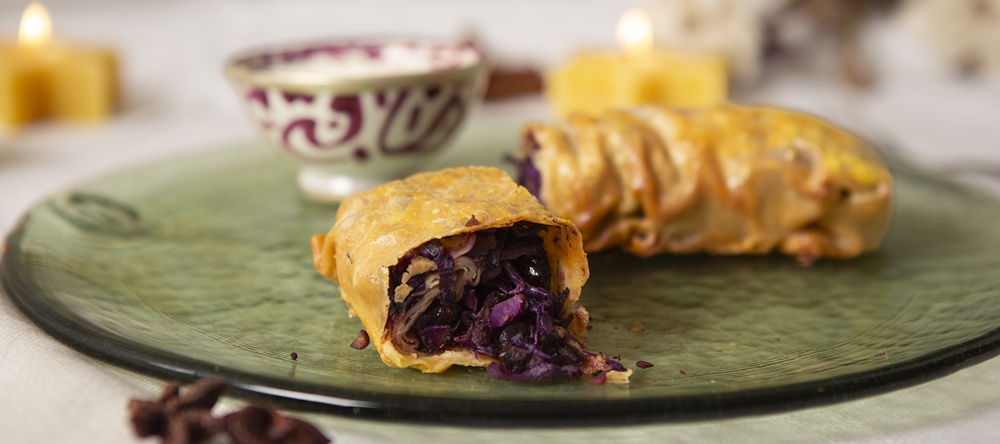Rotkohlstrudel mit Cranberries, Maronen und Joghurt-Feta-Dip