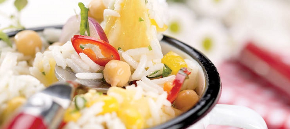 Alle übrigen Zutaten, gekochten Reis und das Dressing vermischen. Mit etwas Salz abschmecken.