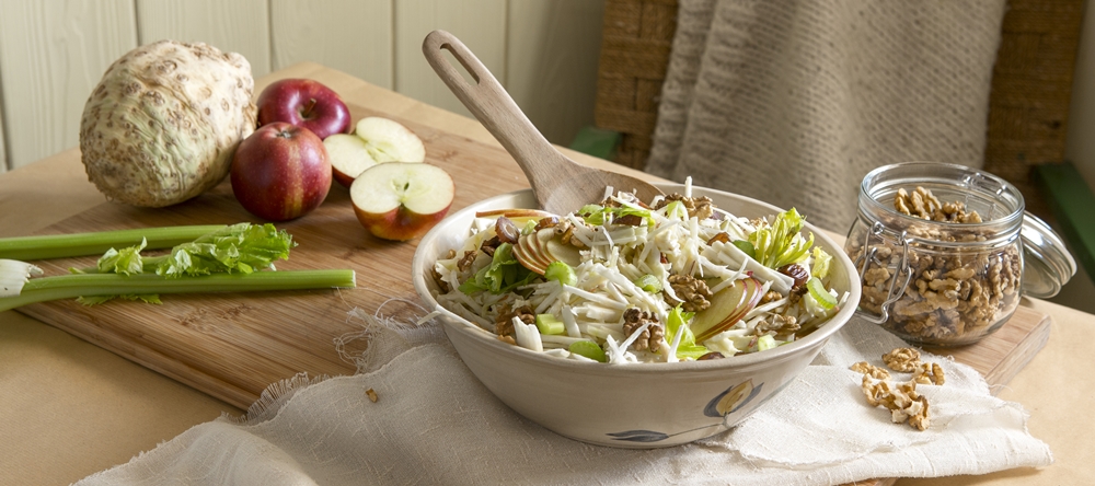Knollensellerie schälen und ebenfalls grob raspeln. Staudensellerie waschen und in sehr feine Scheiben schneiden. Datteln klein würfeln.